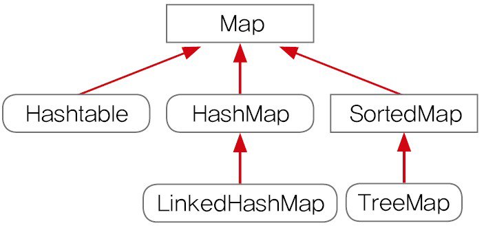 - Map 인터페이스는 이들과 전혀 다른 형태로 컬렉션을 다루기 때문에 같은 상속계층도에 포함되지 않는다.