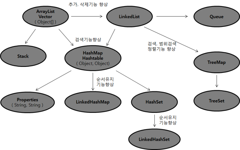 | HashMap | 배열과 연결이 결합된 형태. 추가, 삭제, 검색, 접근성이 모두 뛰어남. 검색에는 최고의 성능을 보임. |