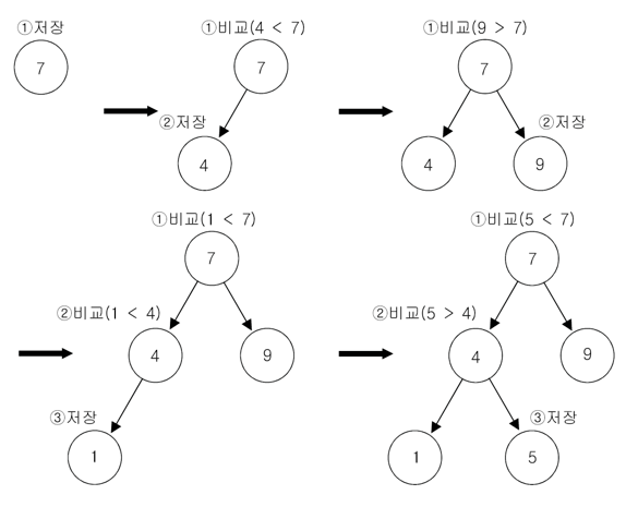 - 첫번째로 저장되는 값이 루트가 되고, 비교하면서 트리를 따라 내려간다.