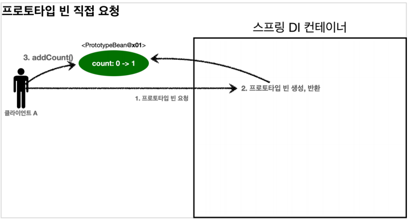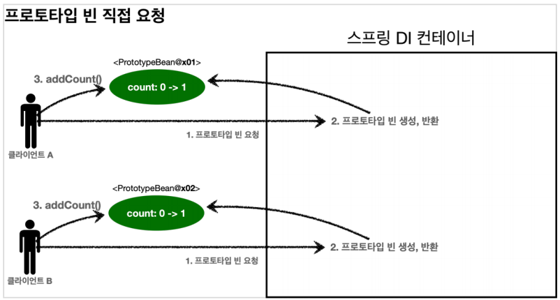 - 6. clientBean은 prototypeBean의 addCount()를 호출. count는 2