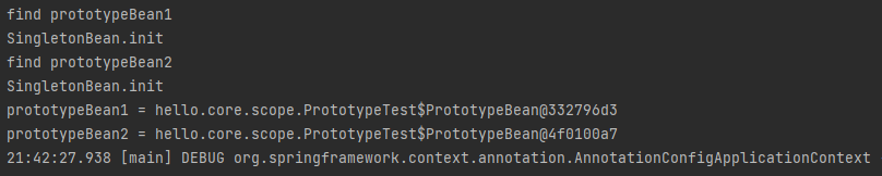 System.out.println("find prototypeBean2"); // 프로토타입은 조회 직전에 생긴다. (init 호출)